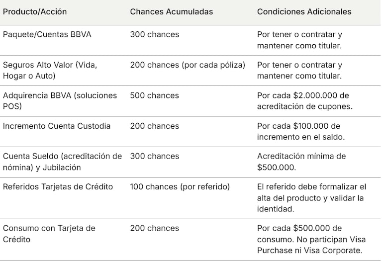 Se otorgarán 200 chances por cada $500.000 (quinientos mil pesos argentinos) de consumo con las tarjetas de crédito BBVA (Visa y/o Mastercard), mediante cualquier canal y en cualquier rubro o comercio. El cliente no debe estar en situación de mora/atraso o situación distinta a “normal”. Si en el plazo de la campaña se contrata y se cancela el producto se restará las chances sumadas. Sólo participan individuos. No participan Visa Purchase ni Visa Corporate.